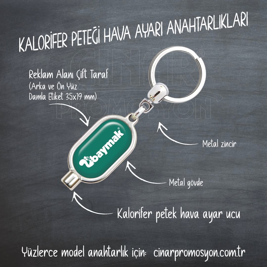 Çınar Promosyon 10152, 10177 ve 10178 kod adlı metal anahtarlıkları bu işlem için tasarlandı. Çift firma-isim reklam alanı olan ve aynı zamanda prujör ayar için gerekli uca sahip bu promosyon ürünü amaçlı anahtarlıklar müşterilerinize sizi hatırlatacak.